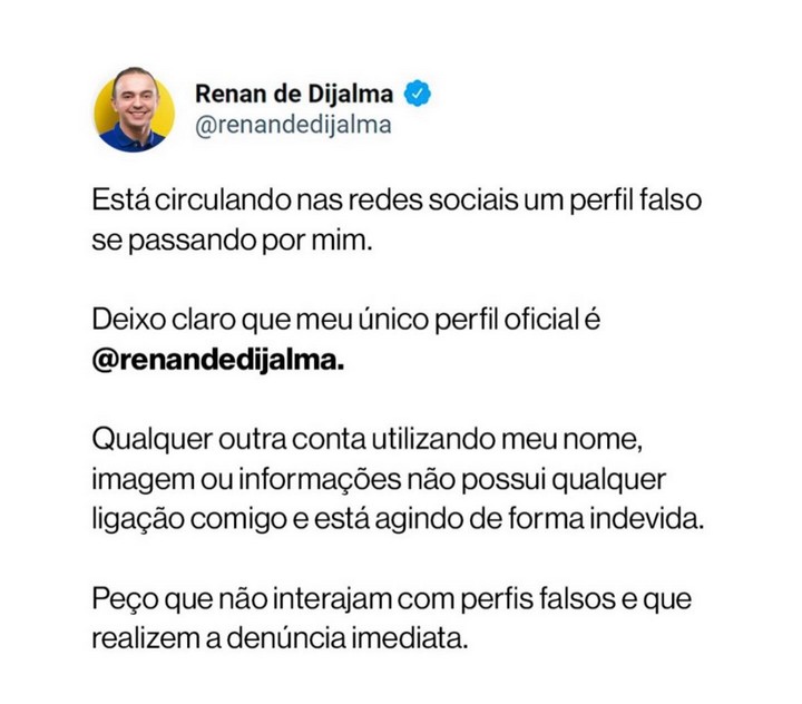 Renan alerta a população para que redobre o cuidado e recuse qualquer solicitação de amizade vinda dessa conta fraudulenta, reforçando que possui apenas um perfil oficial na plataforma, que é @renandedijalma.