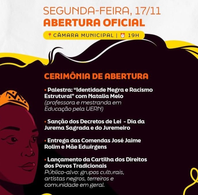 A abertura da programação ocorre nesta segunda-feira, às 19h, na Câmara Municipal de Areia Branca, com a palestra “Identidade Negra e Racismo Estrutural”, com Natália Melo (Professora e Mestranda em Educação pela Uern). Haverá ainda, sanção dos decretos de Lei – Dia da Jurema Sagrada e do Juremeiro; entrega das Comendas José Jaime Rolim e Mãe Edwirgens; lançamento da Cartilha dos Direitos dos Povos Tradicionais, tendo como público-alvo grupos culturais, artistas negros, terreiros e comunidade em geral (veja no final da postagem a programação completa).