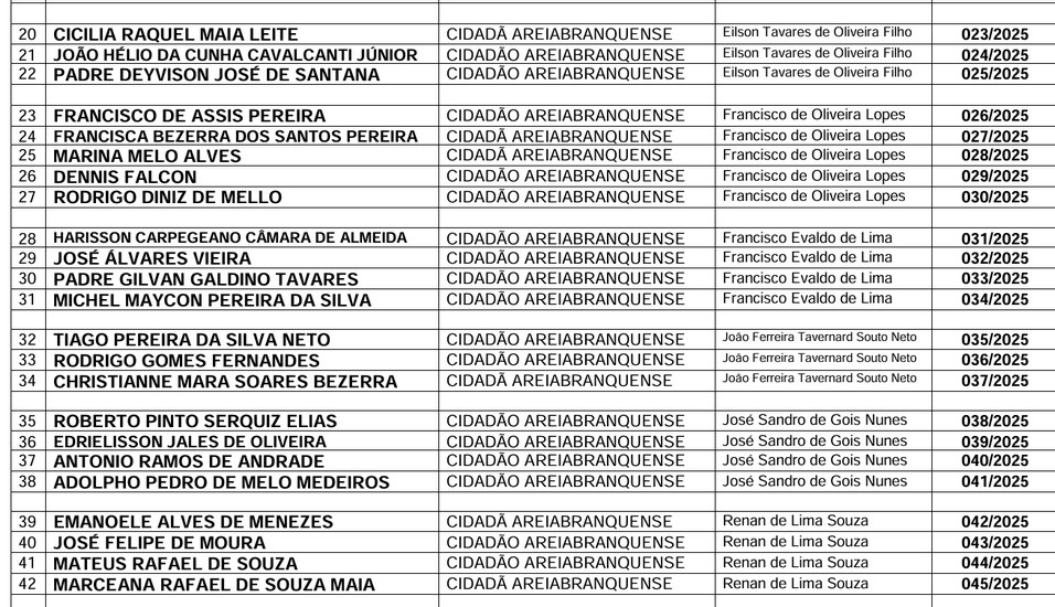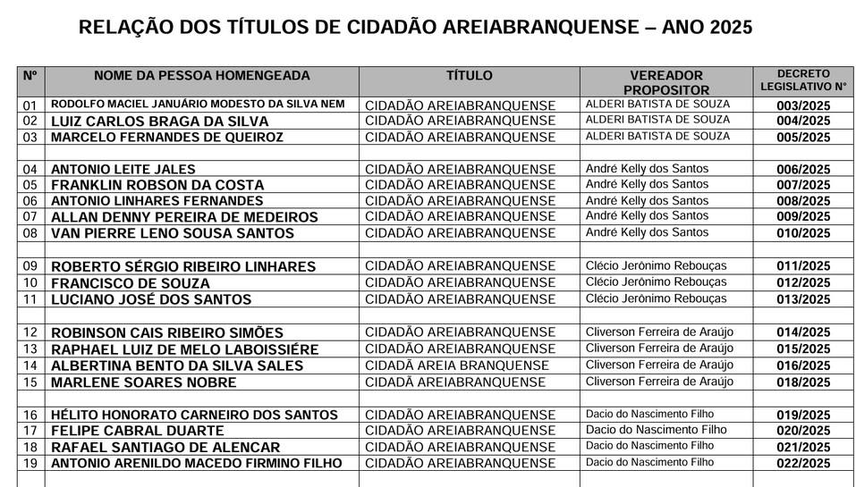 Segue relação oficial dos homenageados pela Câmara de Areia Branca, na sessão especial desta sexta-feira, 17: