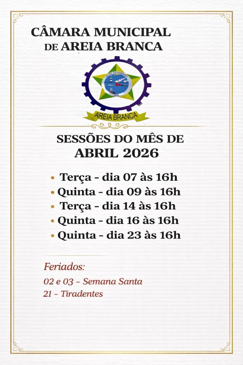 O presidente da Câmara Municipal de Areia Branca, vereador Renan de Lima Souza (União Brasil), divulgou o calendário de sessões ordinárias do mês de abril. Agora, as reuniões do Legislativo passam a acontecer às 16h, sempre às terças e quintas-feiras, no Plenário Euclides Leite Rebouças.