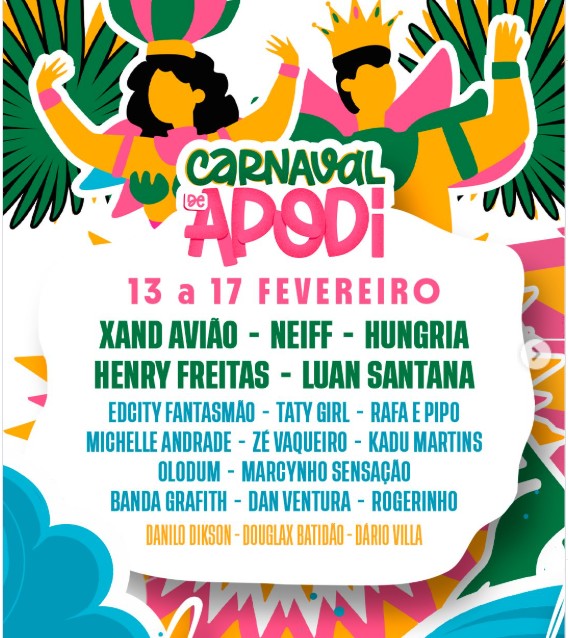 A Prefeitura de Apodi divulgou a programação oficial do Carnaval 2026, que será realizado entre os dias 13 e 17 de fevereiro. O evento contará com atrações nacionais de diferentes estilos musicais, como Luan Santana, Xand Avião e o grupo Olodum, além de artistas populares no circuito de festas do Nordeste.