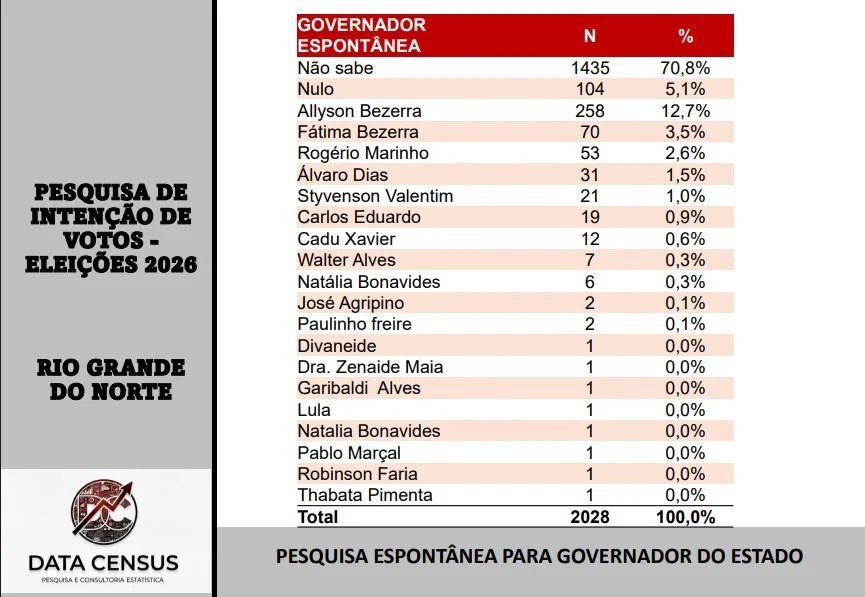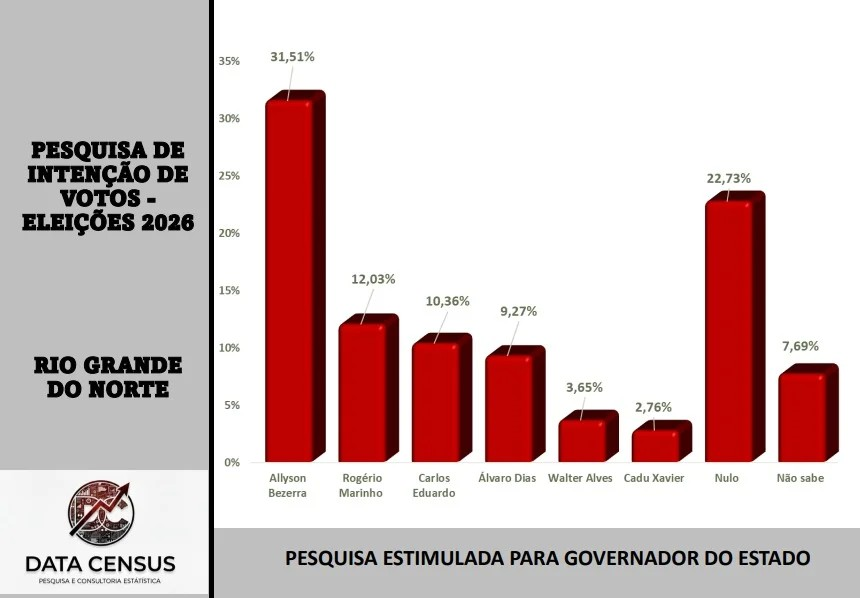 A Data Census divulgou, na segunda-feira, 1º, nova pesquisa sobre a intenção de votos para o Governo do Rio Grande do Norte nas eleições de 2026. O levantamento foi realizado entre 20 e 23 de novembro de 2025 e ouviu 2.028 pessoas em 71 cidades, que representam cerca de 80% do eleitorado do Estado. O atual prefeito de Mossoró, Allyson Bezerra (União), aparece na liderança dos cenários espontâneo e estimulado.