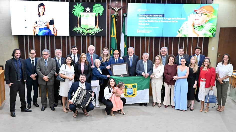 A Assembleia Legislativa reuniu, na tarde desta quarta-feira, 19, familiares, amigos e fãs do radialista e humorista Rodrigo Vieira Emerenciano, para lhe conceder o título honorífico de cidadão norte-rio-grandense. Proposta pelo deputado Hermano Morais (PV), a sessão solene de homenagem ao intérprete de “Mução” contou com a presença do parlamentar Ubaldo Fernandes (PSDB) e de representantes da Secretaria Estadual da Cultura, da Câmara Municipal de Natal e Fundação Djalma Marinho.