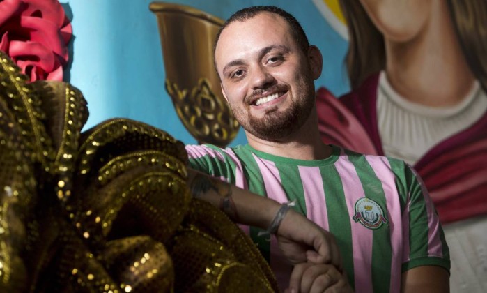 Carnavalesco da Mangueira, Leandro Vieira, posa em frente a Santa Bárbara, na