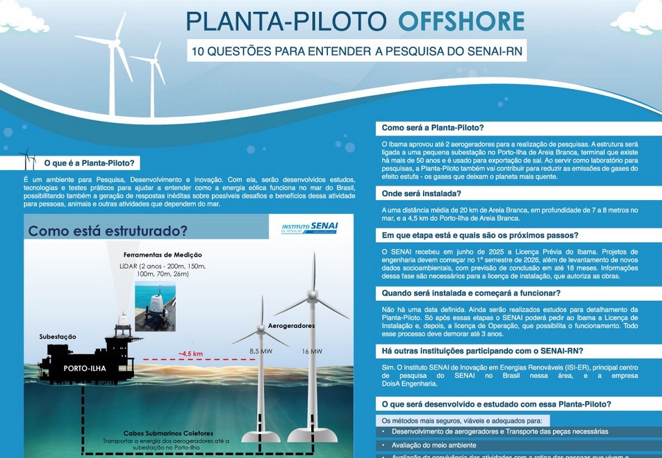 Essas e outras perguntas são respondidas no informativo “Planta-piloto offshore: 10 questões para entender a pesquisa do Senai-RN”, disponível desde a sexta-feira, 19, no site www.rn.senai.br.