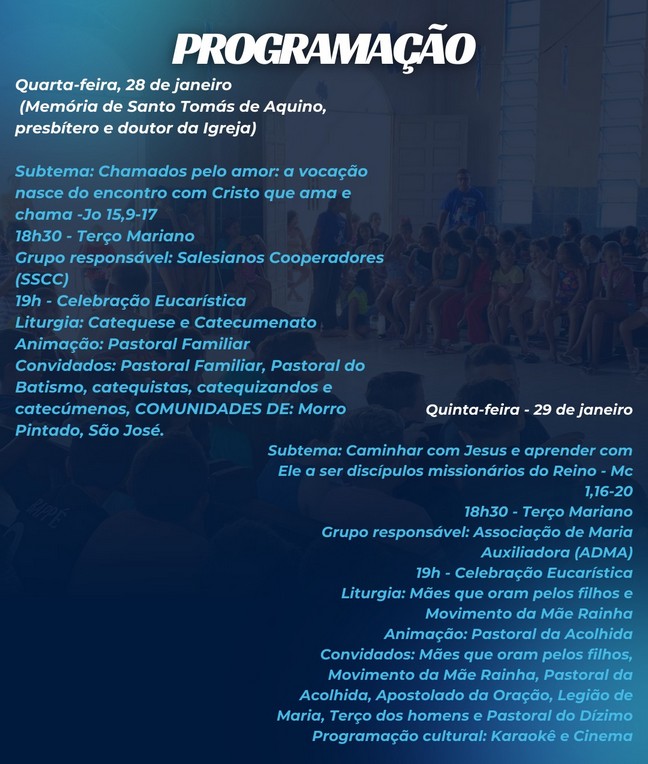 A programação do tríduo será desenvolvida de 28 a 31 de janeiro de 2026, na Igreja de Nossa Senhora dos Navegantes, no Centro juvenil.