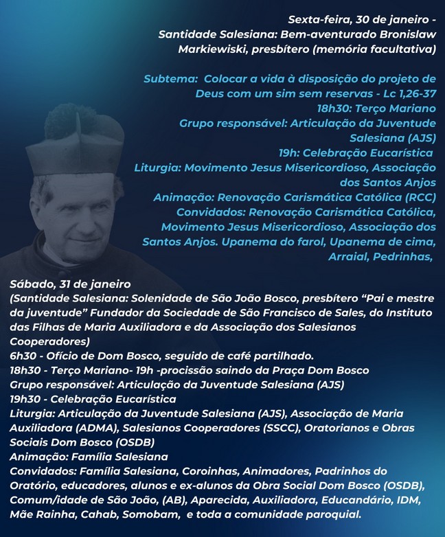 A Paróquia de Areia Branca celebrará nesta semana, o tríduo em honra a São João Bosco, co-padroeiro do município. Serão três dias repletos de fé, oração e momentos de união entre toda a comunidade, famílias, jovens, educadores e devotos.