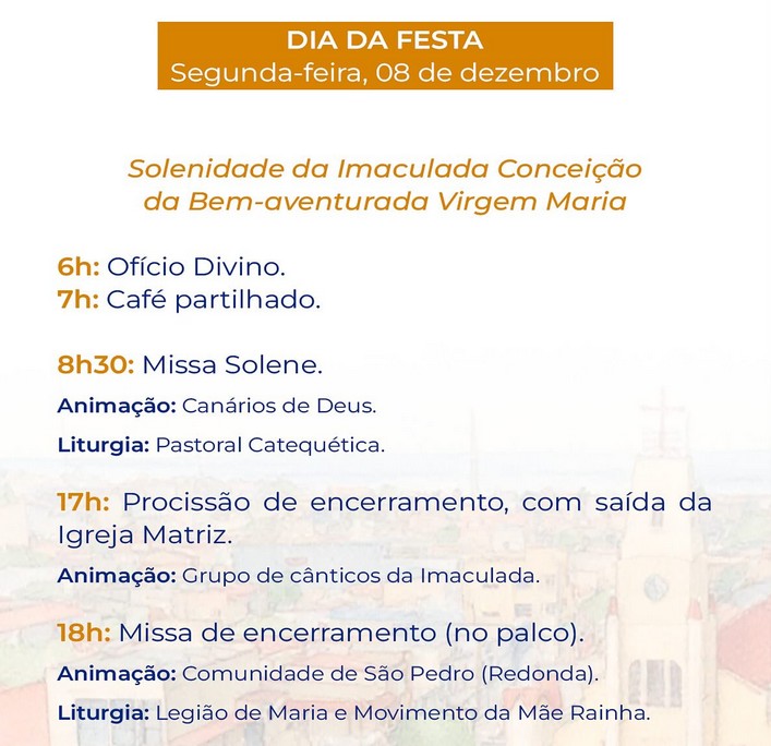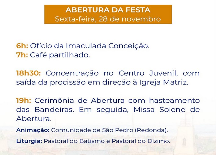 Cita ainda, no comunicado, que no dia 28 de novembro será a abertura da festa e nos dias seguintes, de 29 de novembro a 7 de dezembro acontece o novenário, sempre às 19h. A solenidade da Imaculada Conceição no dia 8 de dezembro, com missa solene e procissão de encerramento. “Venha a celebrar conosco este tempo de graça e alegria!”, completa o sacerdote.