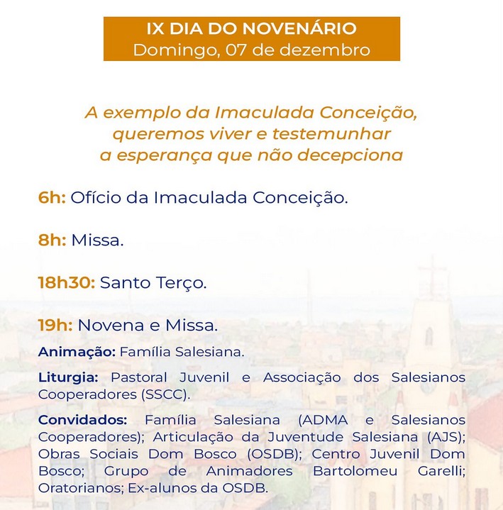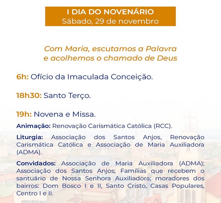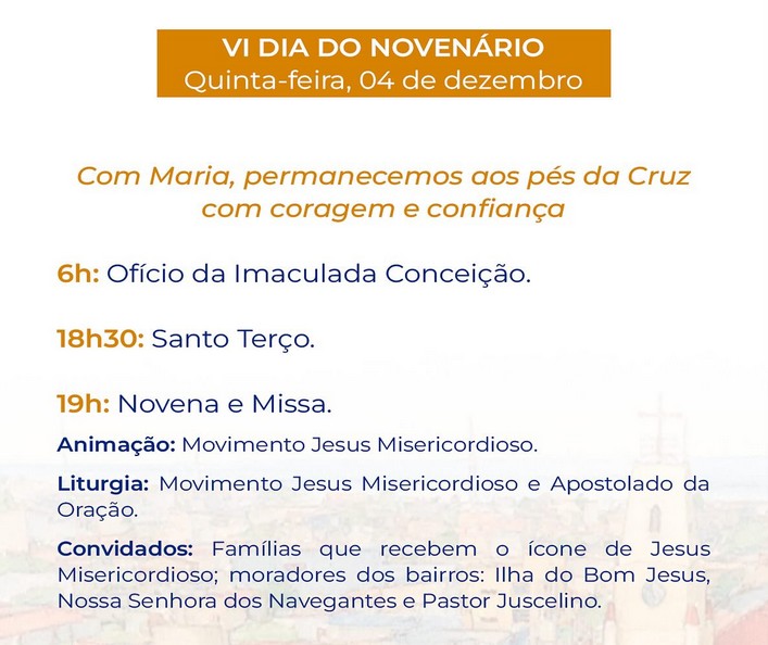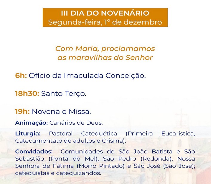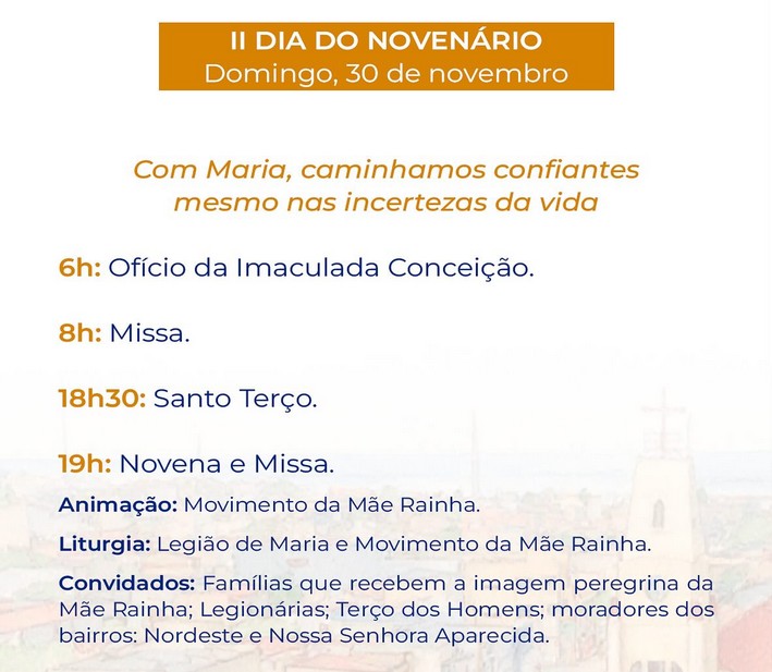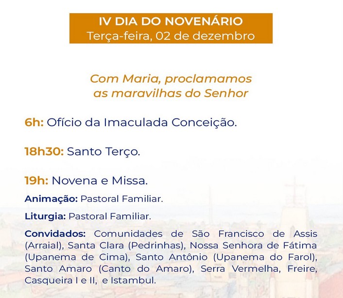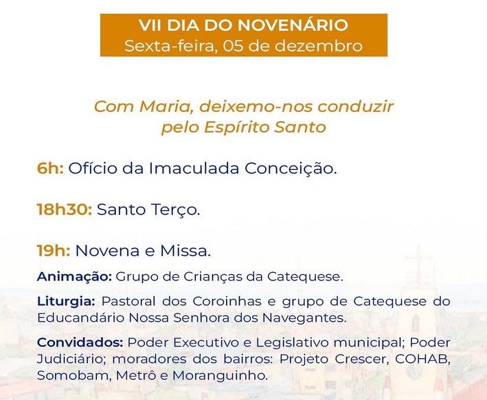 “Durante nove noites de oração, louvor e fraternidade, teremos celebrações eucarísticas momentos Marianos, quermesses, apresentações culturais e encontros de convivência, fortalecendo nossos laços de fé e comunidade”, acrescenta o pároco.
