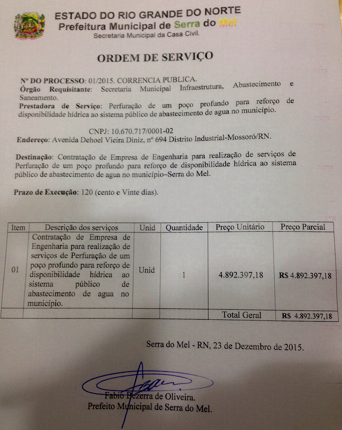 problema da falta d’água do município de Serra do Mel”, diz confiante o