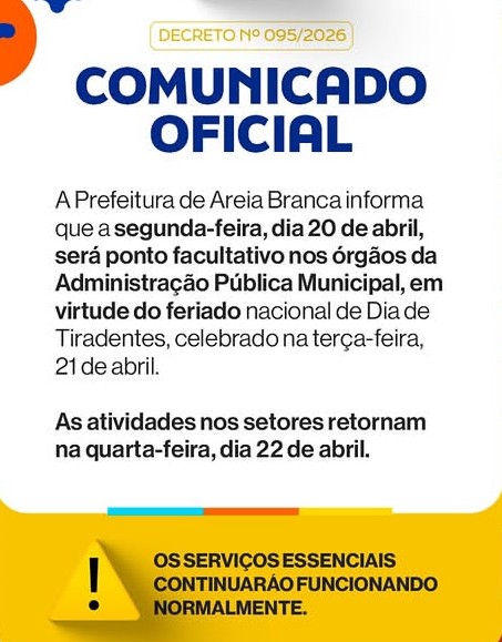 Prefeitura de Areia Branca decreta ponto facultativo na véspera do feriado de Tiradentes