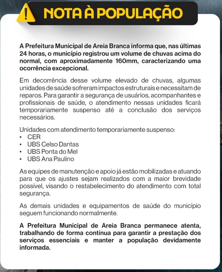Por meio de uma nota oficial, a Prefeitura de Areia Branca informou a suspensão de atividades de diversos órgãos que prestam serviços à população, principalmente na área de saúde. O município registrou nas últimas 24 horas um volume de chuvas acima do normal, com aproximadamente 160mm, caracterizando uma ocorrência excepcional, segundo a gestão.