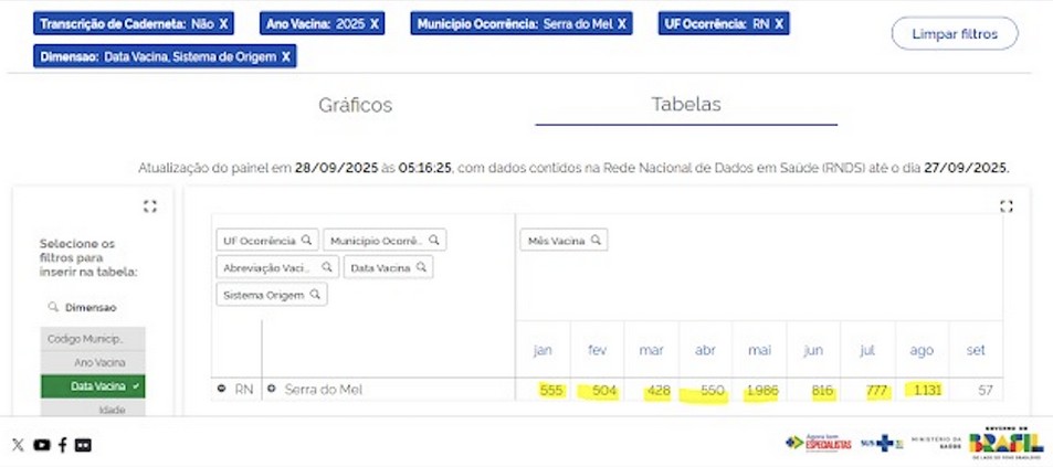 O município de Serra do Mel vem apresentando resultados ainda mais positivos na área da saúde. De acordo com dados do painel de monitoramento da cobertura vacinal do Ministério da Saúde, o número de doses aplicadas à população cresceu de forma significativa nos primeiros oito meses deste ano.