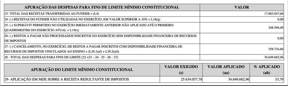 De acordo com o relatório, a prefeitura aplicou R$ 34.649.662,96 em ações de manutenção e desenvolvimento do ensino, valor que supera o mínimo constitucional exigido, que era de R$ 25.634.057,78.
